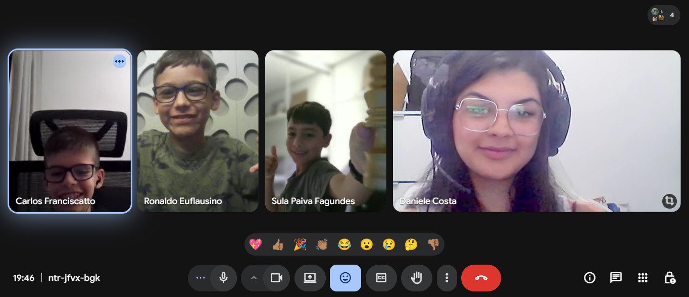 Nesta modalidade de aula, o objetivo é promover interação entre os alunos, jogar e praticar em todos os encontros. Entre os métodos de treinamento proponho torneios, simultâneas online temáticas, exercícios e práticas do conteúdo ministrado com o propósito de fixar o aprendizado. Tudo isso é realizado em aulas descontraídas para que os alunos aprendam, acima de tudo, a amar o xadrez e desfrutar de todos os seus benefícios. Aprender em grupo pode ser mais divertido do que você imagina! Faça um teste com alguma turma! Quantidade mínima de alunos por aula: 2 Quantidade máxima de alunos por aula: 10